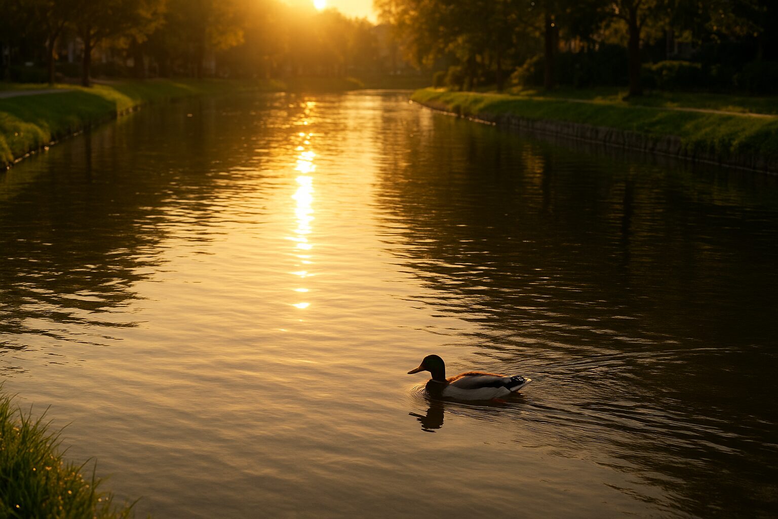 水辺では、鳥が羽を休め、魚が静かに泳ぎ、